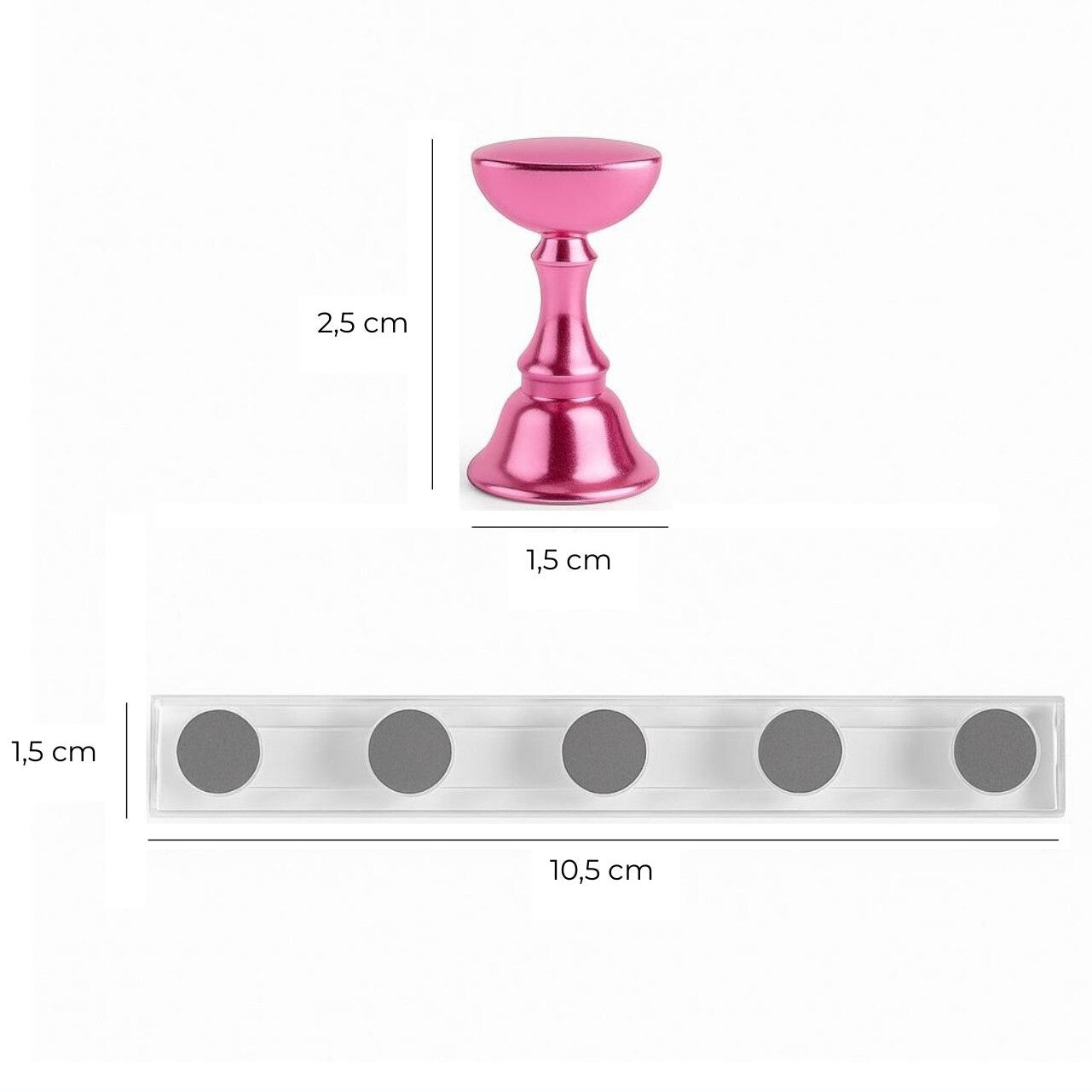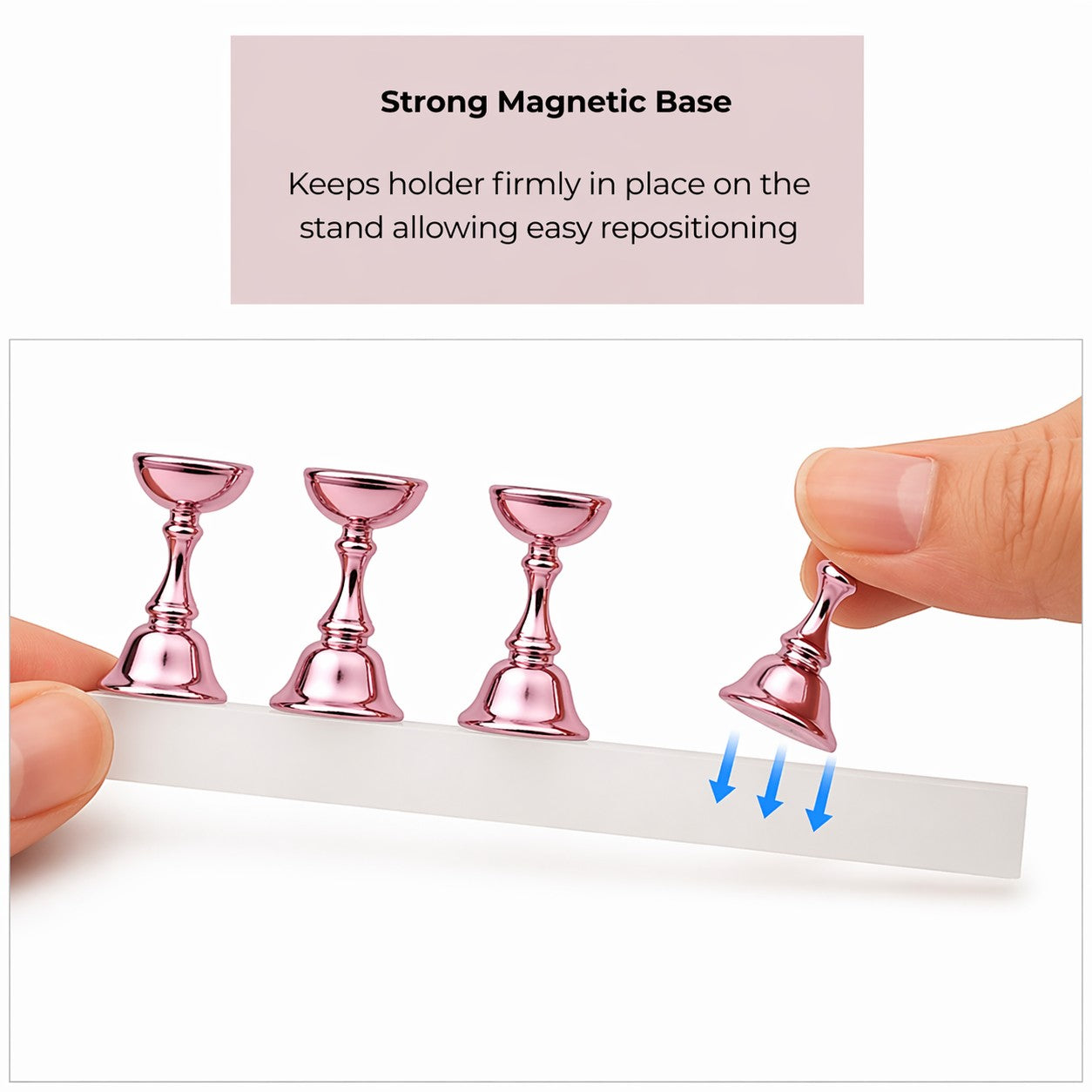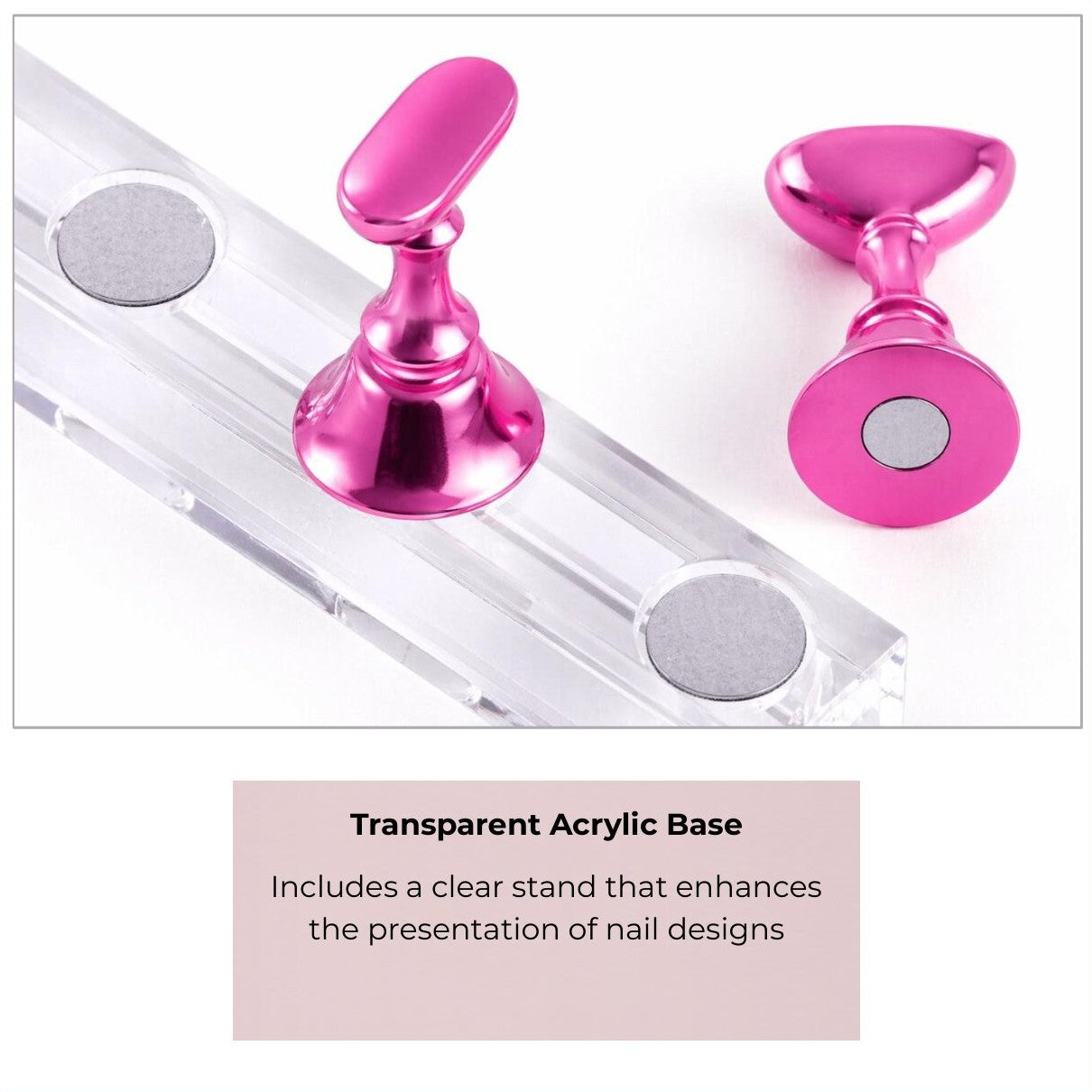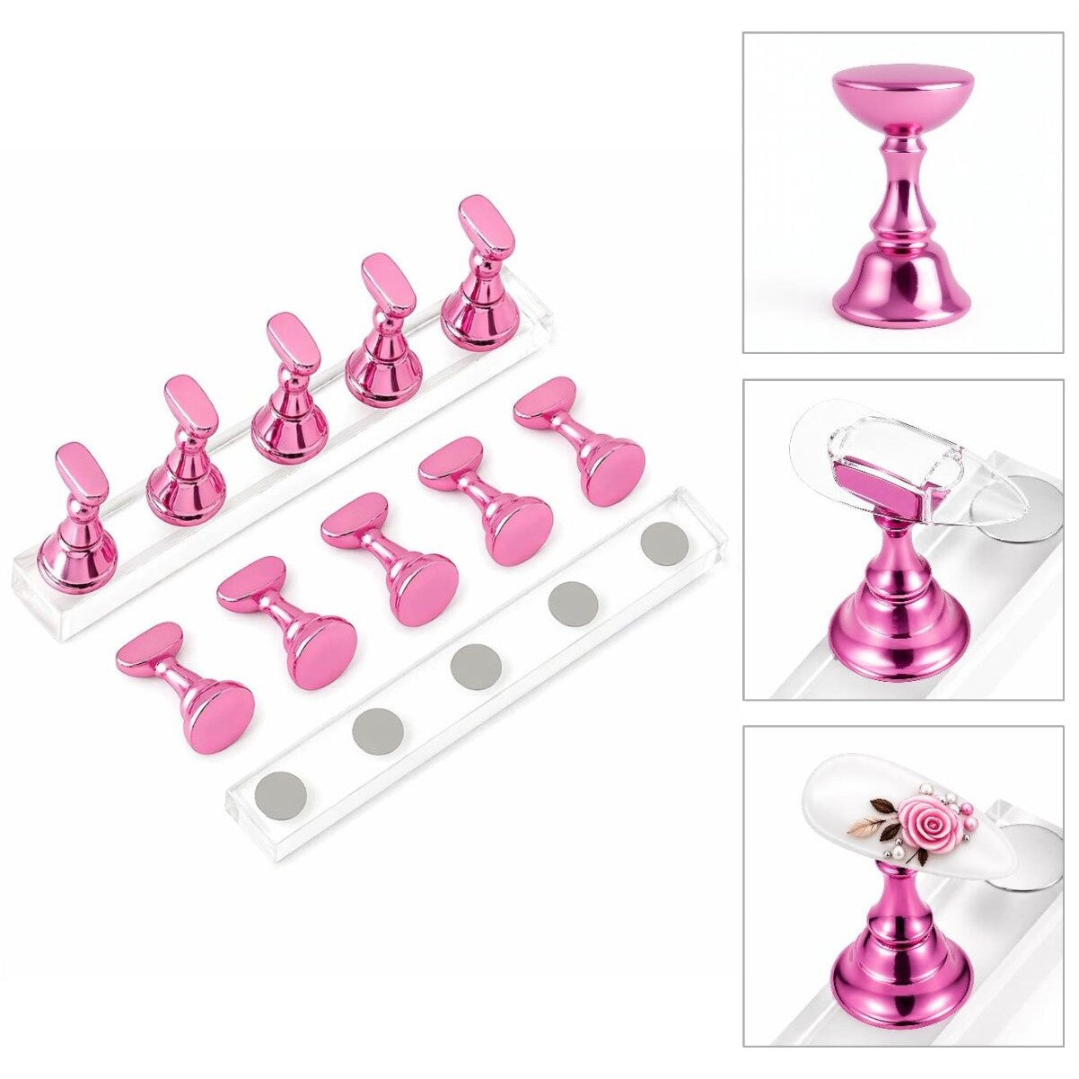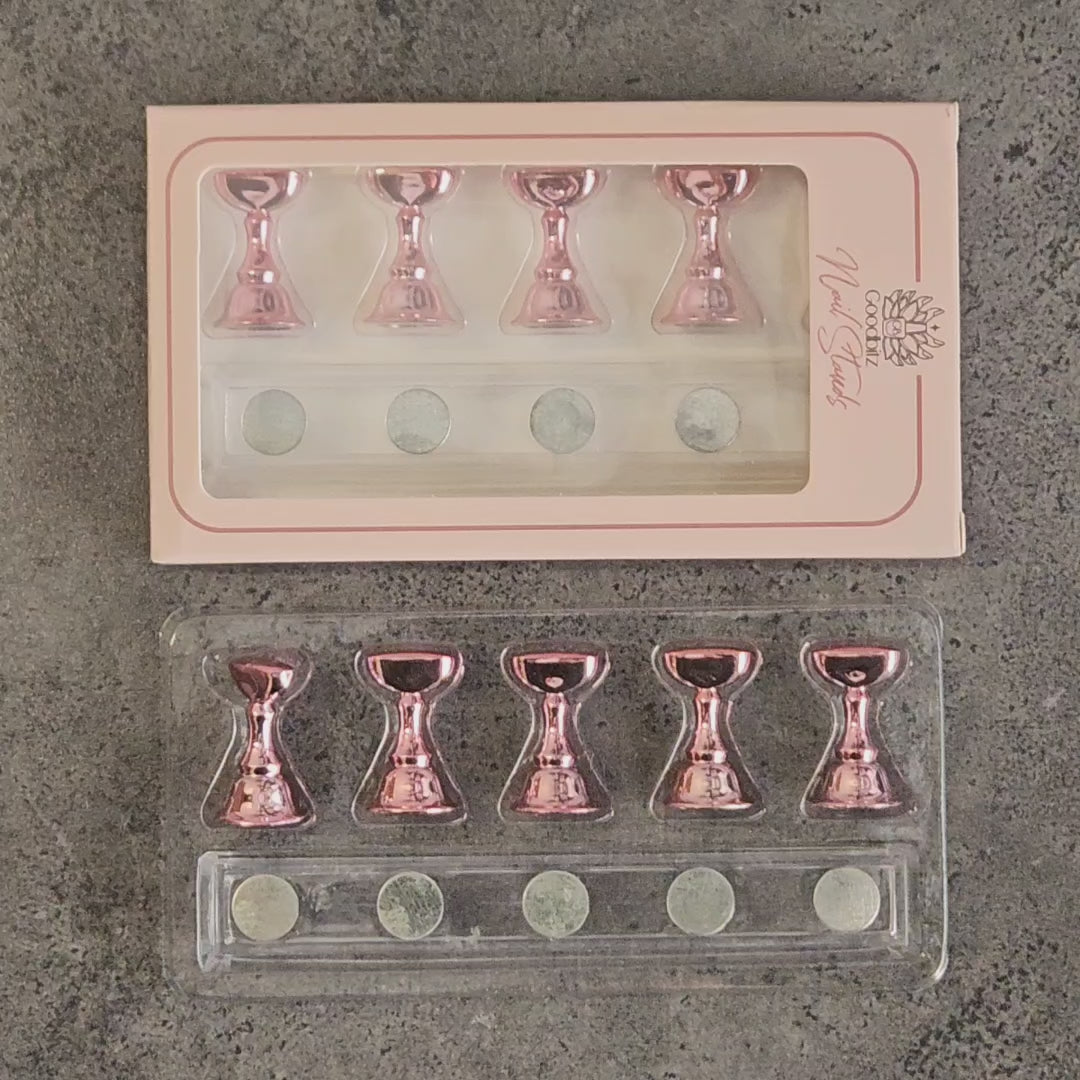 - Magnetische bodem: Elke nagelhouder is voorzien van een sterke magneet aan de onderzijde. Hierdoor blijft de houder stevig en stabiel op zijn plaats staan tijdens het lakken, decoreren of oefenen, zonder te verschuiven.