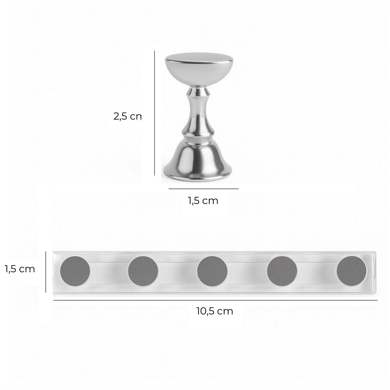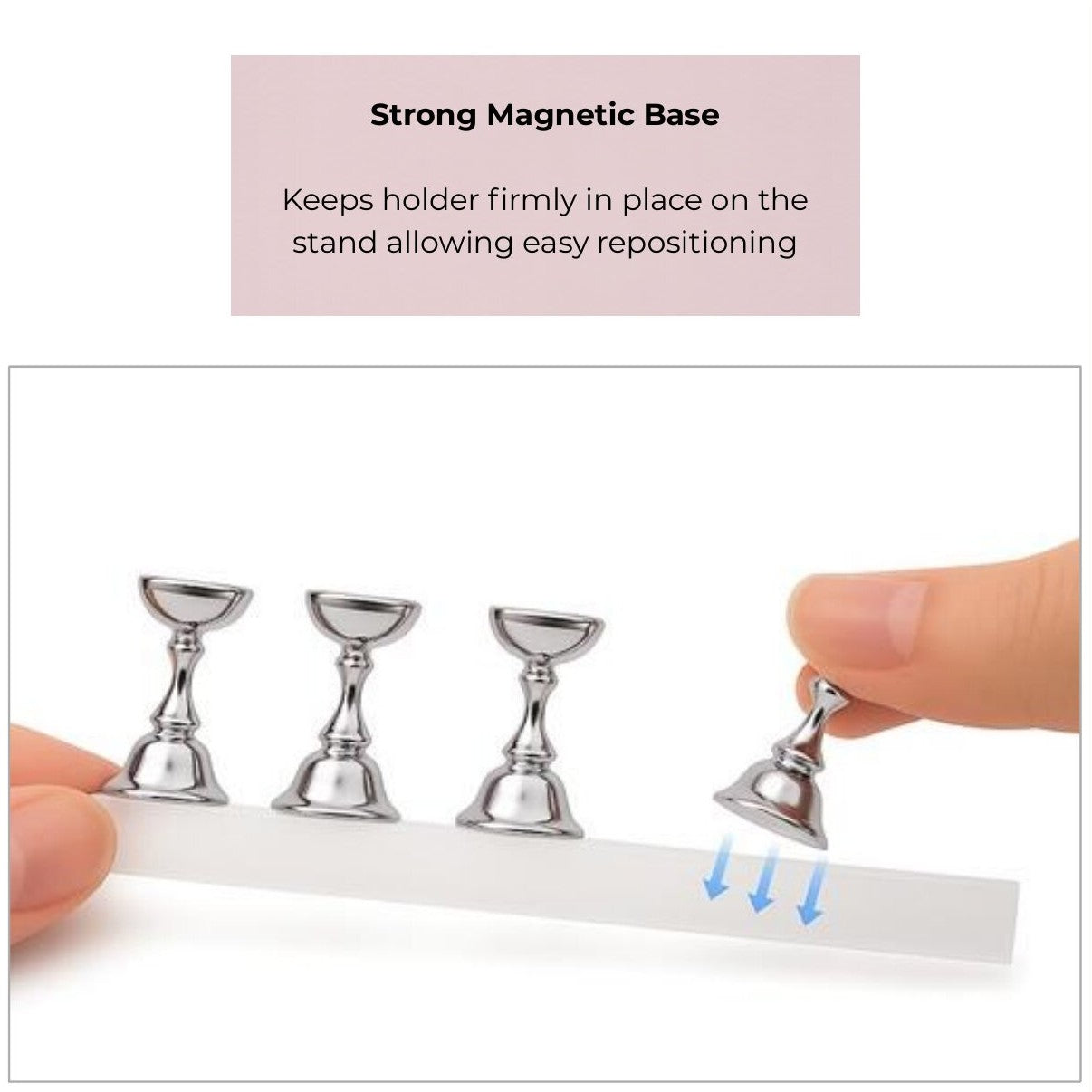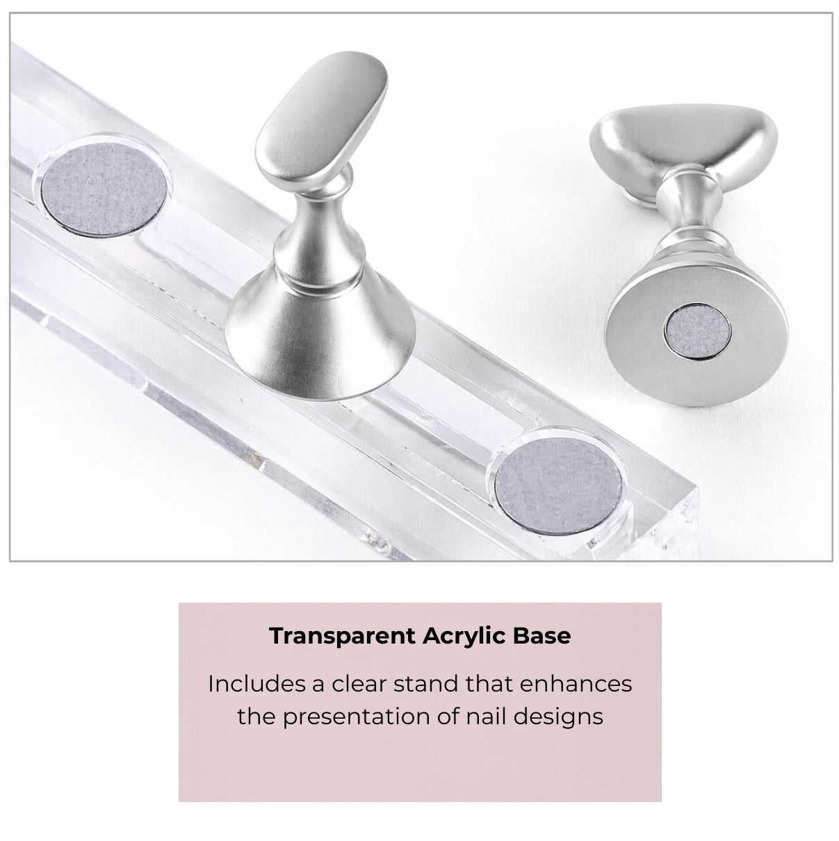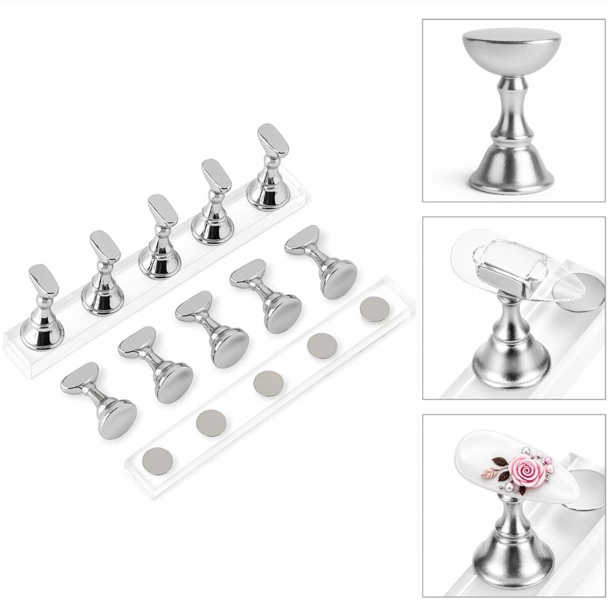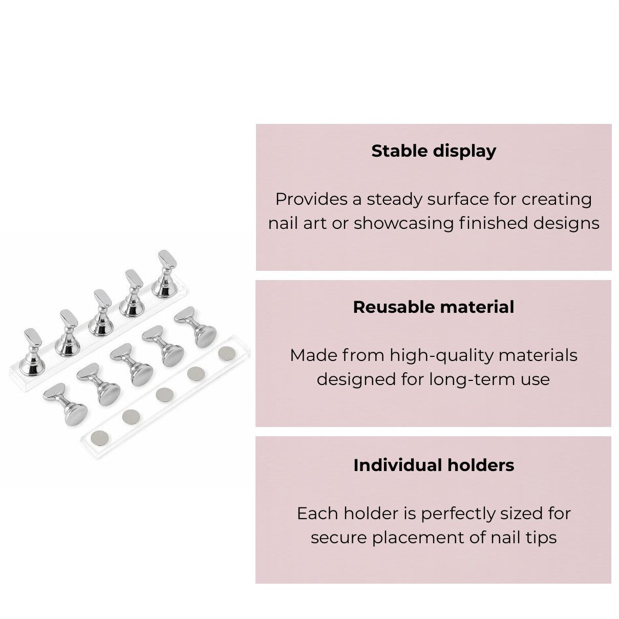 - Magnetische bodem: Elke nagelhouder is voorzien van een sterke magneet aan de onderzijde. Hierdoor blijft de houder stevig en stabiel op zijn plaats staan tijdens het lakken, decoreren of oefenen, zonder te verschuiven.