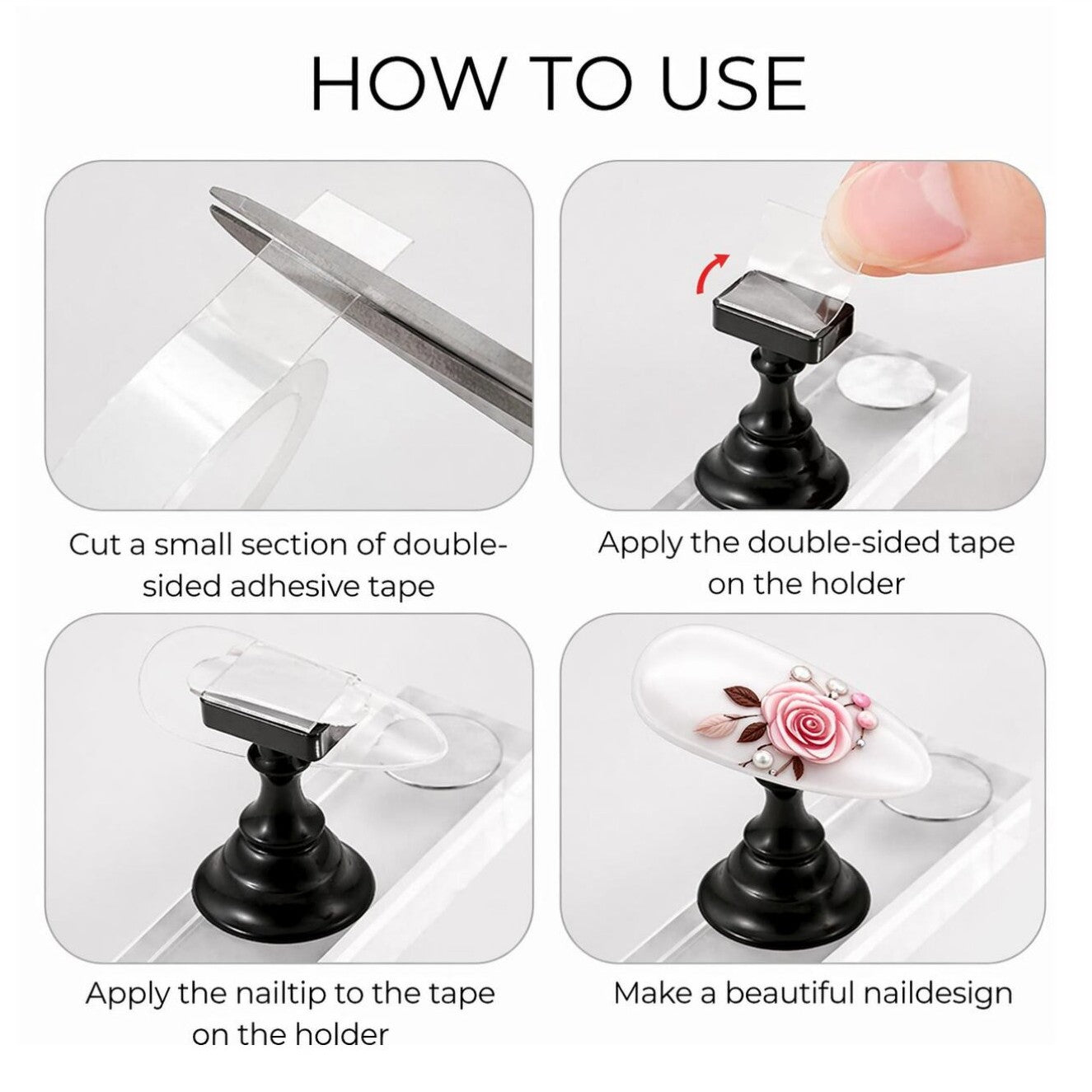 - Gebruik: Ontworpen om oefennagels of tips veilig vast te zetten tijdens het aanbrengen van gellak, nailart, designs of andere technieken. Dit zorgt voor meer controle en precisie tijdens het werken.